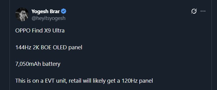 今回の情報は、リーカーのYogesh Brar氏がX上で共有したものです。同氏によると、確認されたのはEngineering Validation Test、いわゆるEVT段階の試作機とのことです。EVTは開発初期の検証モデルにあたり、この後にDVTやPVTといった量産前テストが控えているため、最終仕様は変更される可能性があります。