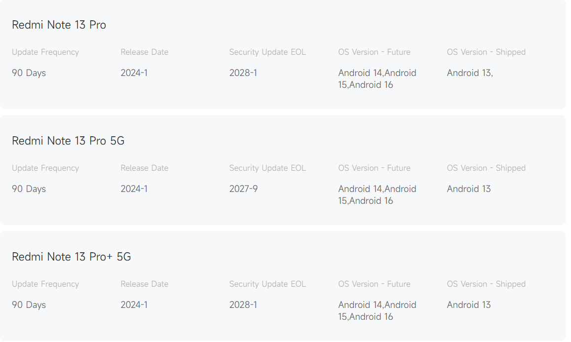 Xiaomiの公式セキュリティアップデート方針によると、Redmi Note 13 Pro、Pro 5G、Pro+ 5Gの最終OSバージョンはAndroid 16になる予定です。