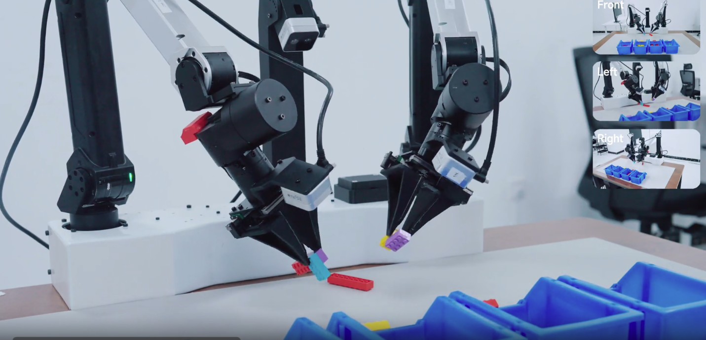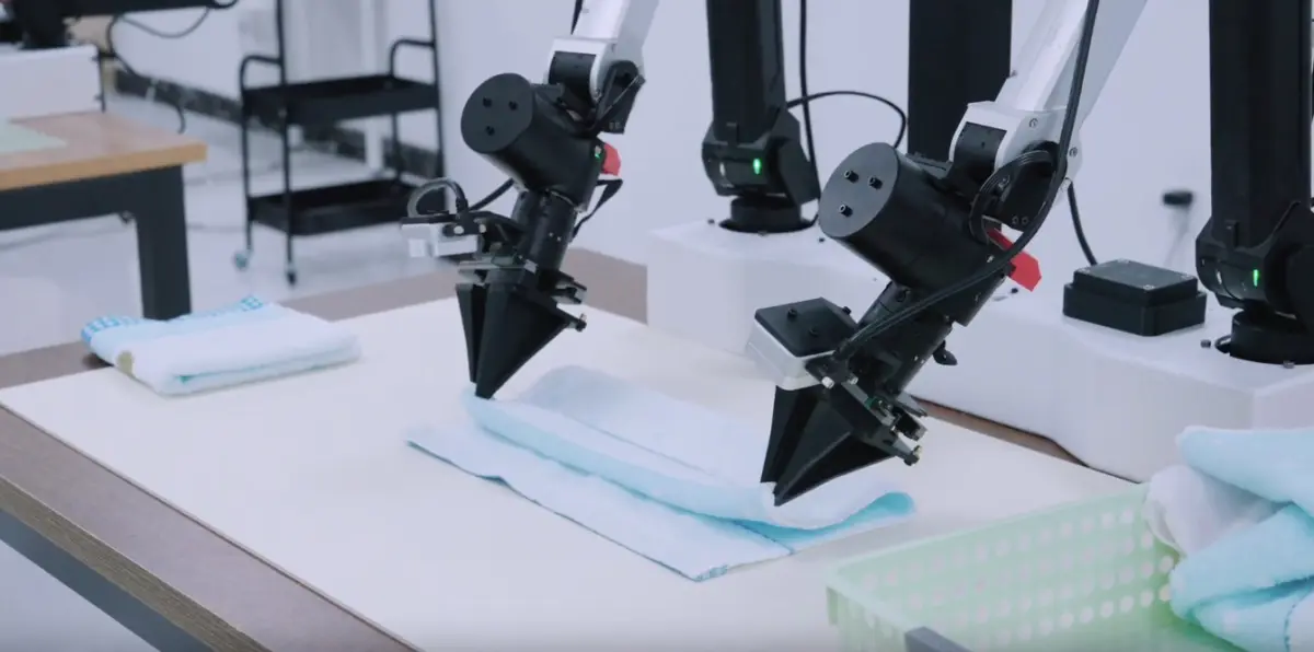 さらに、デュアルアームロボットに実装した実機検証も実施。タオルを折りたたむ作業やブロックの分解といった長時間タスクにおいて、安定した手と目の協調動作を実現したと報告されています。硬い物体だけでなく、柔軟な対象物も扱える点が強調されています。