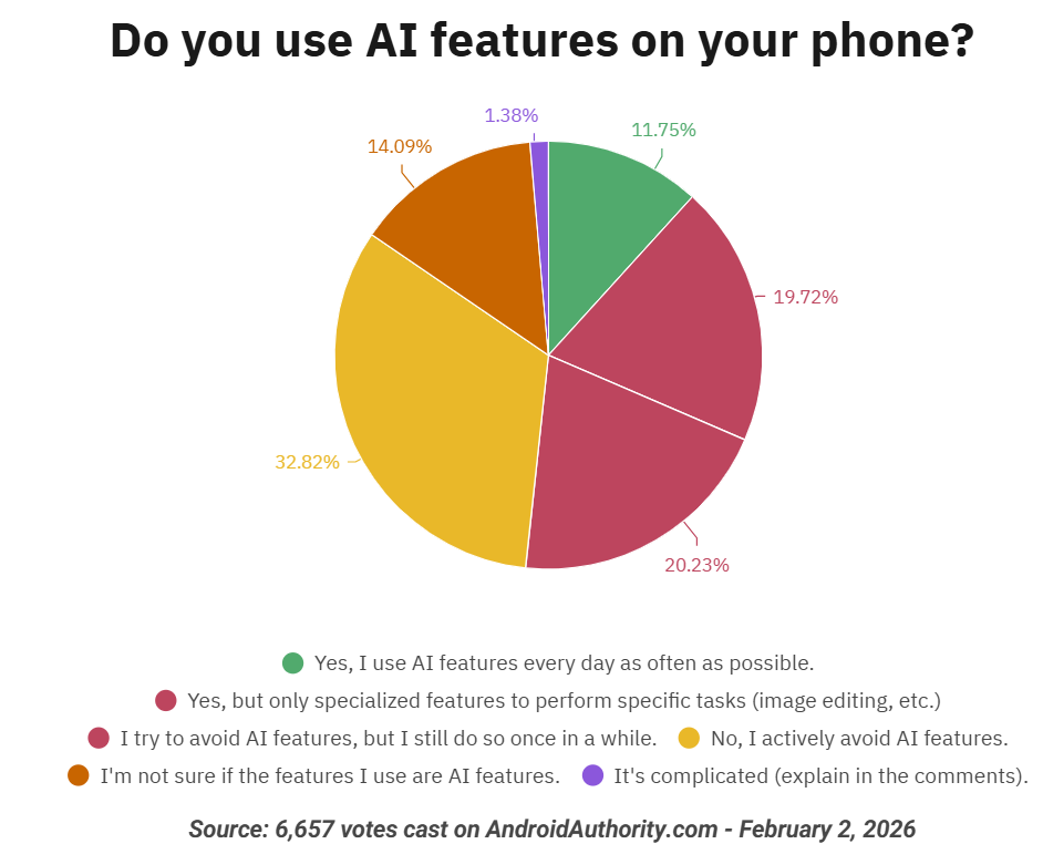 この調査には約6,600人のユーザーが参加しました。その結果、最も多かった回答は「いいえ、積極的にAI機能は避けている」で、回答者の約33%を占めました。背景には、生成系AIに関する倫理的・環境的懸念のほか、画像生成や天気要約、通知要約など一部のAI機能の完成度が十分でない点が影響していると考えられます。