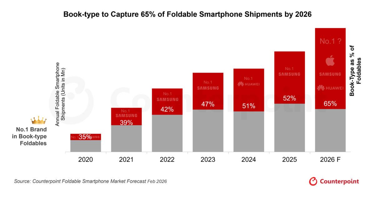 同調査によると、ブック型折りたたみ端末は2026年に世界の折りたたみスマホ出荷の約65%を占めると予測されています。これは2025年の52%から大幅に増加する見込みで、ハードウェアの改善や使いやすさの向上、高価格帯へのOEMの自信が背景にあります。一方で、クラムシェル型はスタイル重視やエントリープレミアム向けの補完的なモデルとして位置付けられ、市場シェアは徐々に減少する見通しです。
