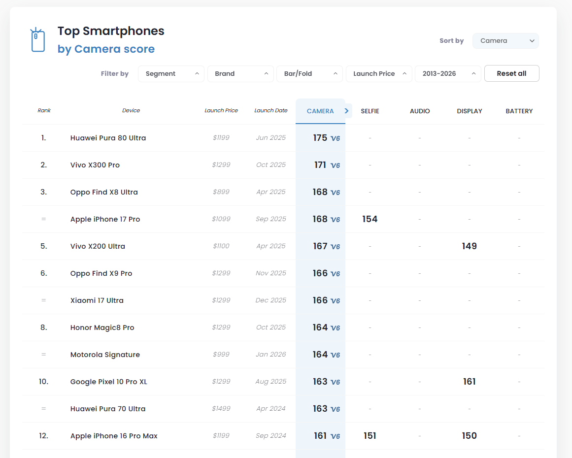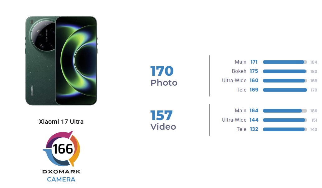 Xiaomi 17 Ultraの総合スコアは166ポイントで、現在のスマートフォンランキングでは6位に位置しています。4位のApple iPhone 17 Pro(168ポイント)や、トップのHuawei Pura 80 Ultra(175ポイント)には及びません。また、よく比較対象にされるOppo Find X9 Proも166ポイントで同点ですが、旧型のFind X8 Ultra(168ポイント)にはわずかに届かない結果となっています。つまり、最新最上位モデルでありながら、Oppoの昨年の最上位モデルに若干劣る形です。