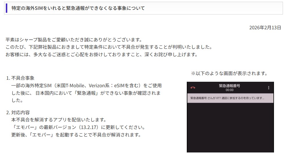 シャープは2026年2月13日、同社スマートフォン「AQUOS」シリーズの一部端末において、日本国内で緊急通報ができなくなる不具合が確認されたと発表しました。対象は米国通信事業者のT-MobileおよびVerizon系のSIM(eSIMを含む)を使用したことがある端末です。