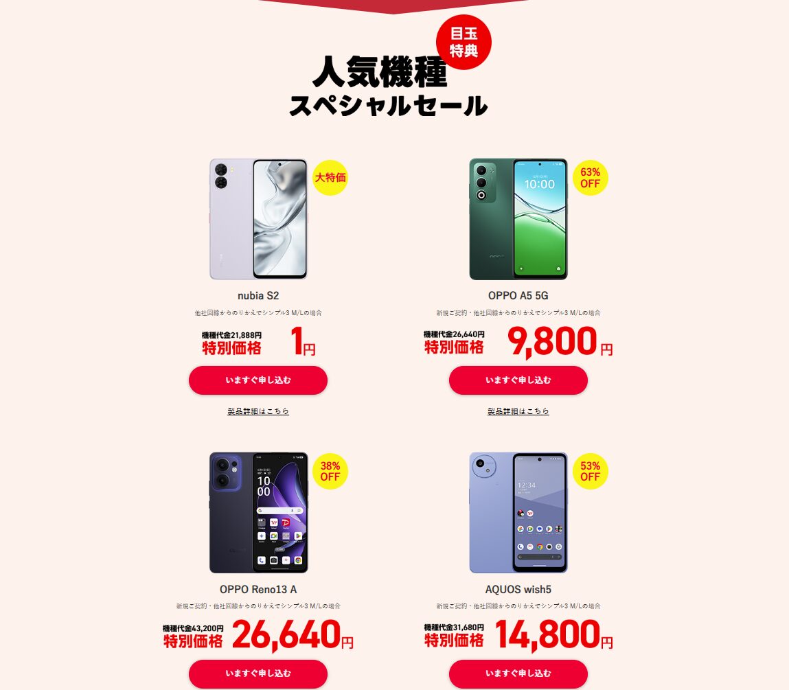 シャープのエントリーモデルであるAQUOS wish5も対象です。定価31,680円が、シンプル3 M/Lで新規または他社からのりかえの場合14,800円となり、16,880円の割引が適用されます。