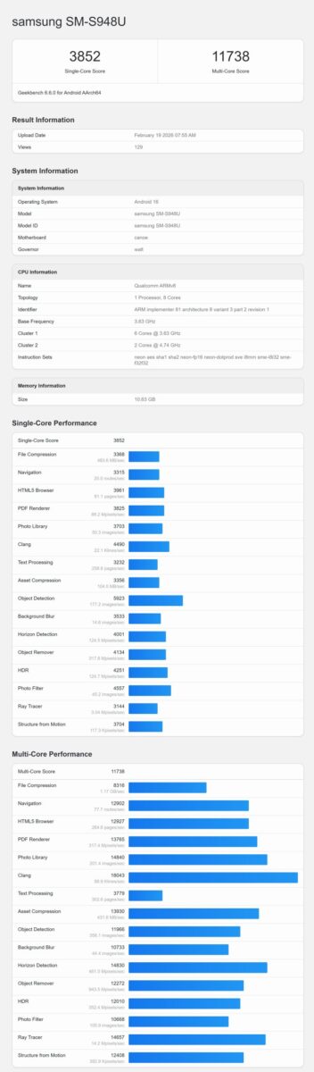 公開されたGeekbench 6のスコアによると、Galaxy S26 Ultraはシングルコアで3852、マルチコアで9,4桁台に迫る高い数値を記録しています。