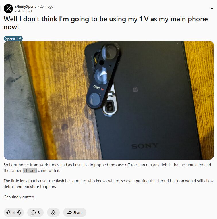 海外掲示板Reddit上で、「Xperia 1 V」のカメラ部分のカバーが外れてしまったという投稿が話題になっています。投稿者によると、ケースを外して清掃しようとしたところ、カメラ周辺のカバー部品が一緒に外れてしまったとのことです。