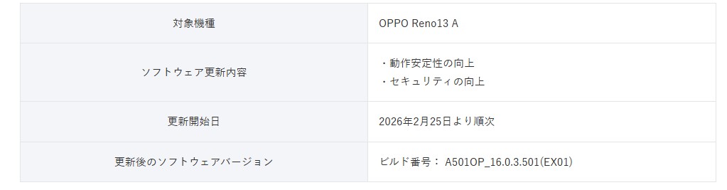 「OPPO Reno13 A」では、動作安定性の向上とセキュリティ強化が主な更新内容です。
