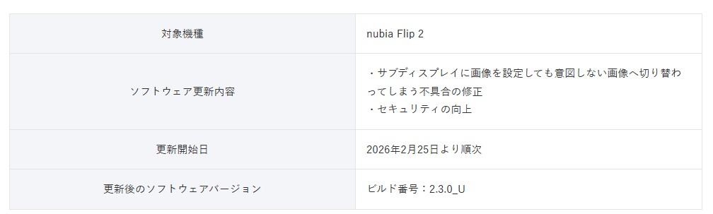 「nubia Flip 2」では、サブディスプレイに画像を設定しても意図しない画像へ切り替わってしまう不具合が修正されます。あわせてセキュリティ向上も図られています。