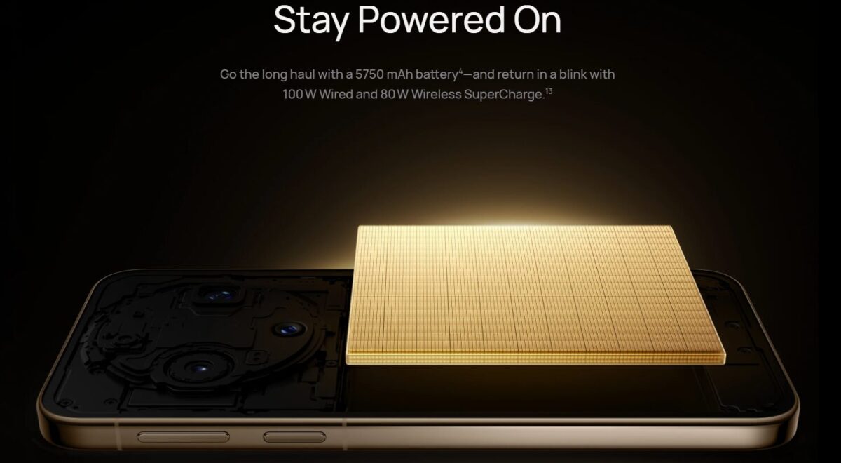 バッテリーは5,750mAh(定格5,620mAh)で、100W有線充電および80Wワイヤレス充電に対応。IP68およびIP69の防塵・防水性能を備え、高圧水ジェットや最大6メートルまでの水中30分沈める条件下でも保護されます。