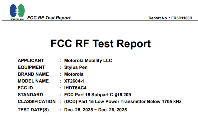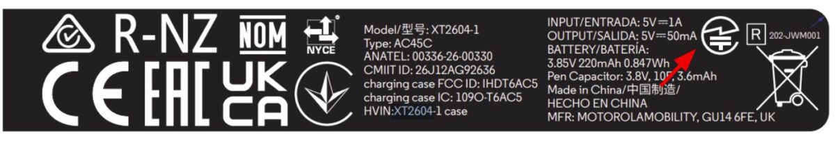 今回確認されたのは、型番「XT2604-1」とされるモトローラ製スタイラスペンの充電ケースです。FCCの認証資料には、総務省の技適マークが表示されていることが分かっています。