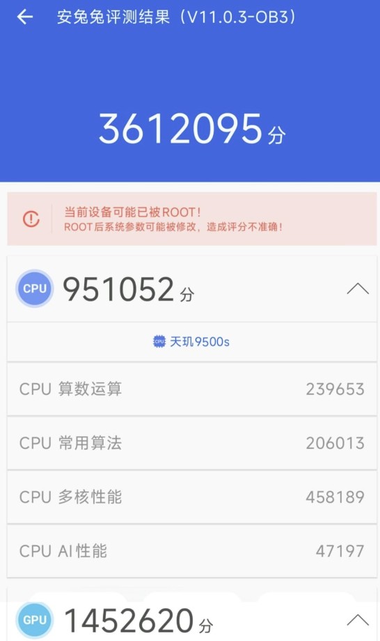 情報によれば、「Poco X8 Pro Max」はAnTuTuベンチマークテストで3,612,095点を獲得したとされています。使用されたのはAnTuTu V11.0.3-OB3で、内訳はCPUスコアが951,052点、GPUスコアが1,452,620点という結果です。