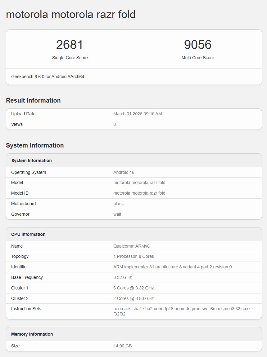 Geekbenchの情報によると、Razr FoldはQualcommのSnapdragon 8 Gen 5を搭載。シングルコアスコアは2,681、マルチコアスコアは9,056を記録しており、ハイエンドモデルにふさわしいパフォーマンスが期待できます。