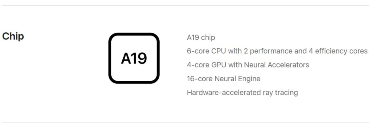 iPhone 17eに搭載されるA19は、6コアCPU構成で、高性能コア2基と高効率コア4基という点はiPhone 17と共通です。しかしGPUは4コア仕様となっており、iPhone 17のA19より1コア少ない構成となっています。