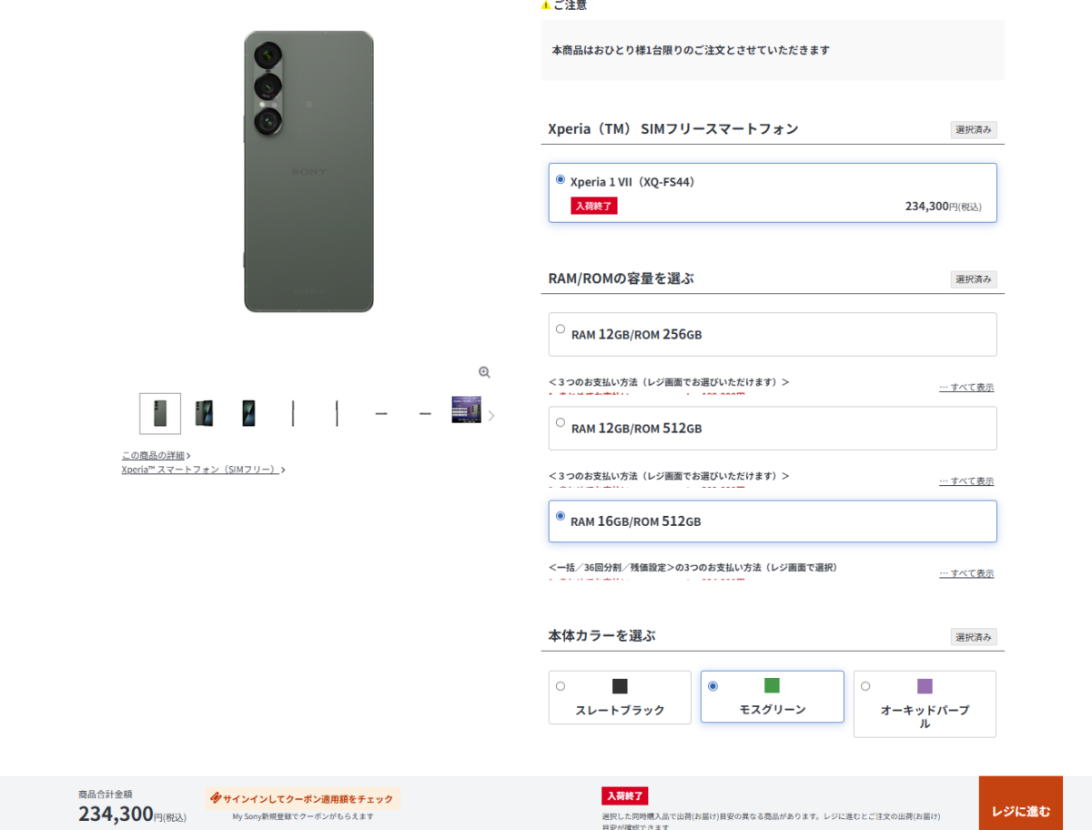 ソニーストアで販売中のSIMフリーモデル「Xperia 1 VII」に、在庫状況の変化が出ています。最上位構成となる16GBメモリ/512GBストレージのモスグリーンが、現在「入荷終了」表示となりました。