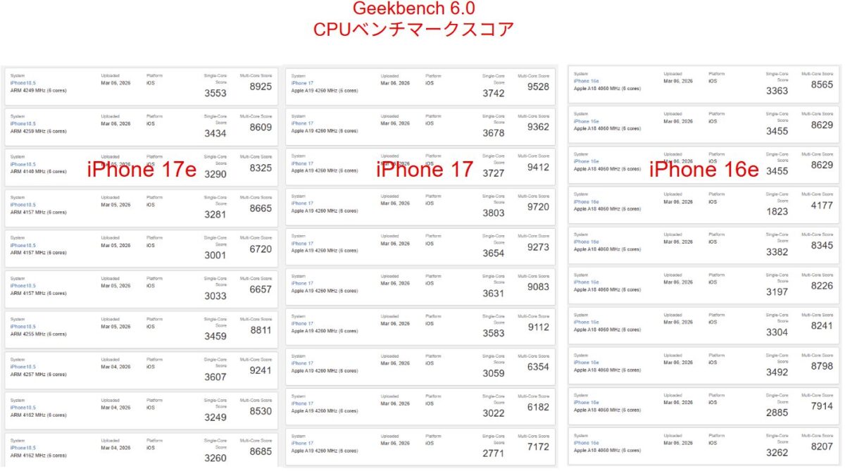 最近公開されたベンチマークデータから、Geekbench 6におけるCPUスコアをもとに、iPhone 17e、iPhone 17、そして前世代モデルのiPhone 16eの性能差が明らかになってきました。