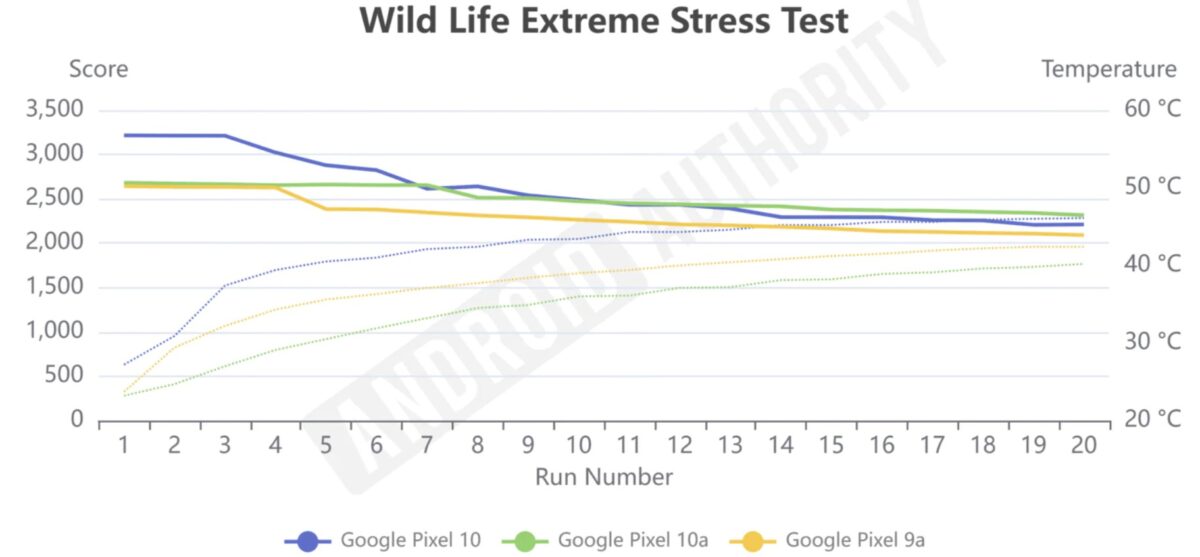 Pixel 10aは3機種の中で最も低い温度を維持しながら動作し、性能低下が始まるまで約7分持続しました。その時点ではすでにPixel 9aの方が先に性能抑制が始まっており、結果としてPixel 10aは上位モデルのPixel 10に近いパフォーマンスまで追いつく場面も見られたといいます。