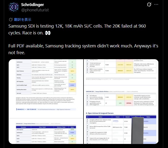 スマートフォン向けバッテリーの次世代技術として注目されている「シリコンカーボン電池」ですが、Samsungが試験していた超大容量モデルが耐久テストで基準を満たせず、開発が見送られていたことが明らかになりました。リークされた資料によって、同社の実験の詳細が徐々に見えてきています。