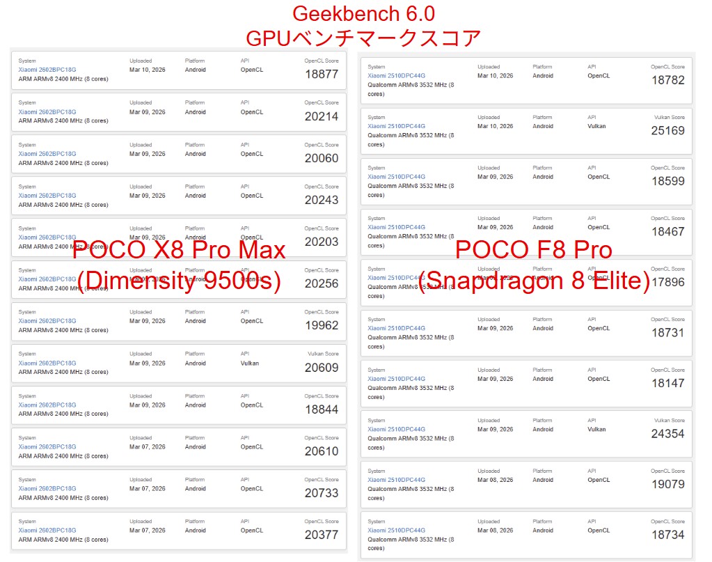 OpenCLスコアを見ると、POCO X8 Pro Maxはおおむね20000前後のスコアを記録しており、ばらつきも比較的小さく安定しています。対してPOCO F8 Proは18000台後半が中心となっており、平均値ではX8 Pro Maxの方がやや高い結果となっています。