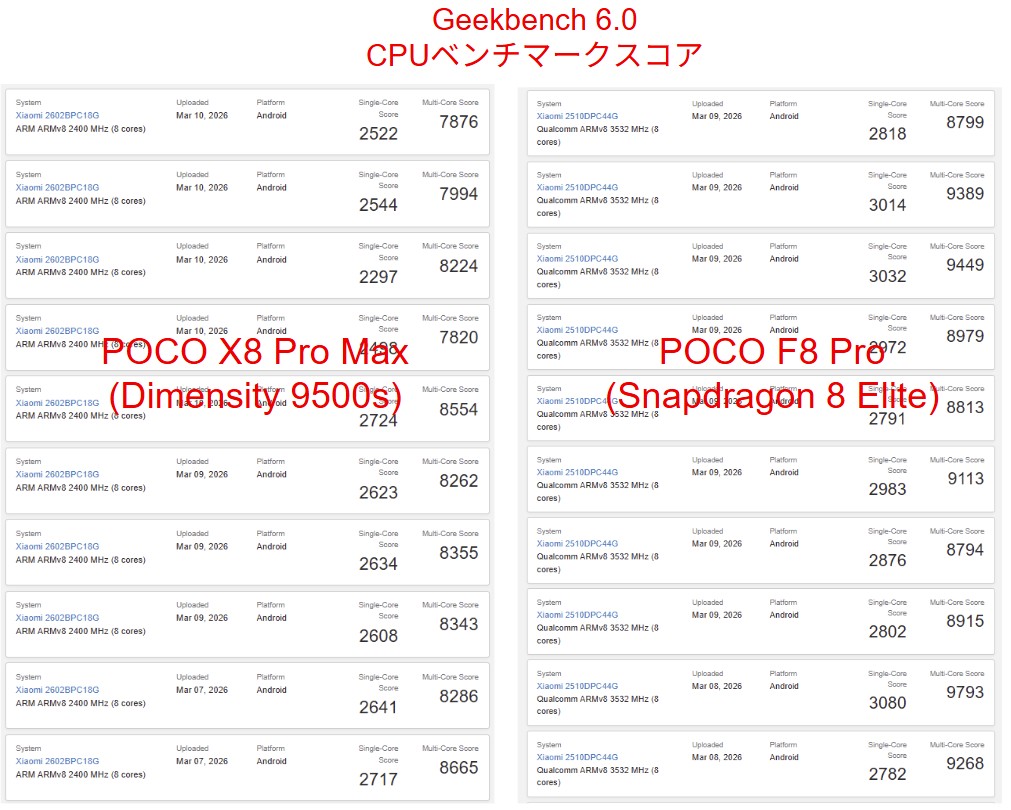 POCO F8 Proのシングルコアスコアはおおむね2800~3000台前半、マルチコアスコアは8800~9700前後で推移しています。一方、POCO X8 Pro Maxのスコアはシングルコアで2500~2700台、マルチコアで7800~8600前後が中心となっています。