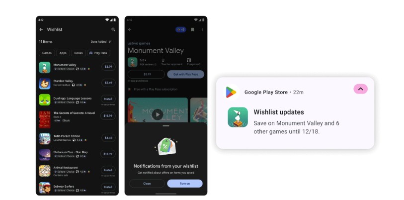 Google Playには、気になるゲームを保存できるウィッシュリスト機能も導入されます。登録しておくと、価格が下がった際に通知を受け取れる仕組みです。