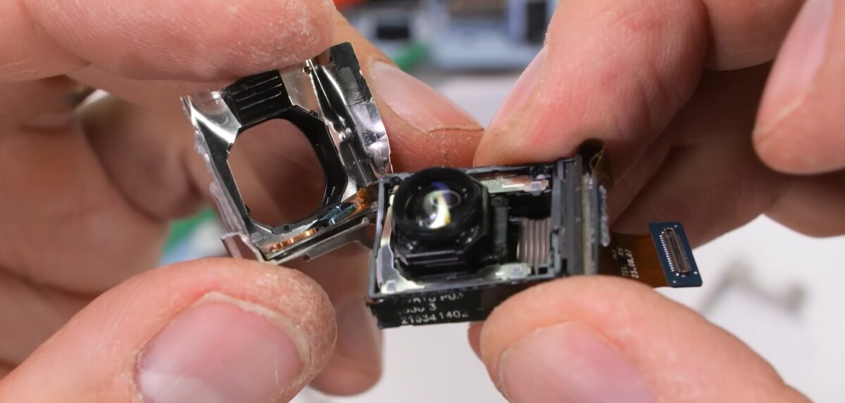 人気YouTuberのZack Nelson氏(JerryRigEverything)が公開した最新の分解動画では、Galaxy S26 Ultraの内部、特に5倍ペリスコープカメラの構造を詳しく確認できます。動画内の8分付近で、新しい「ALoP」設計のカメラモジュールが紹介されています。