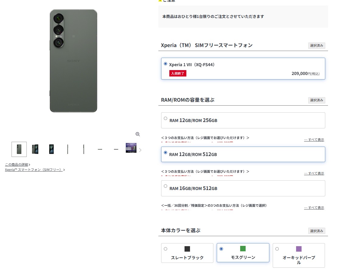 先日、SIMフリー版Xperia 1 VIIの一部カラーやストレージ構成が「入荷終了」となっていることをお伝えしましたが、今回新たに12GB/512GBのモスグリーンも入荷終了となったことが判明しました。