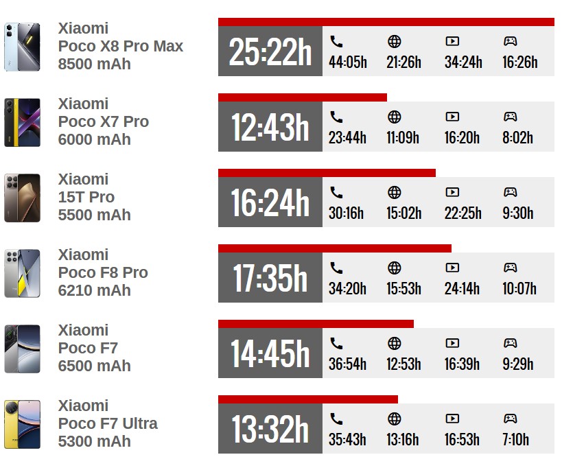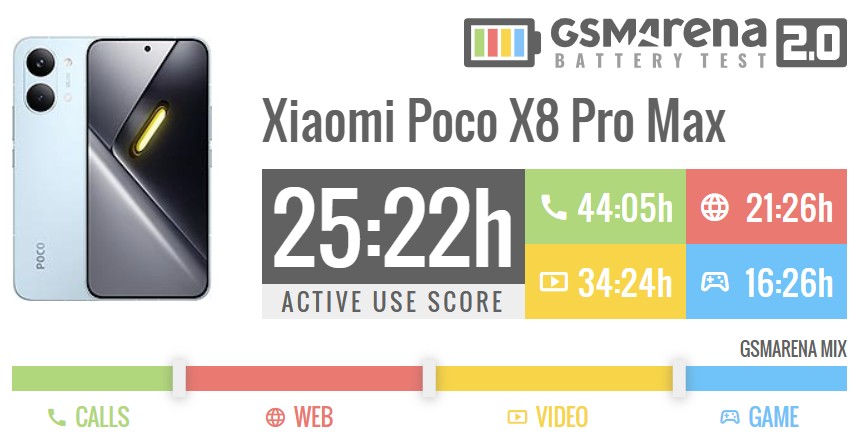 実際、海外メディアによるテストでは、POCO X8 Pro Maxはアクティブユーススコア25時間超という非常に高い数値を記録しており、従来モデルや競合機を大きく引き離す結果となっています。