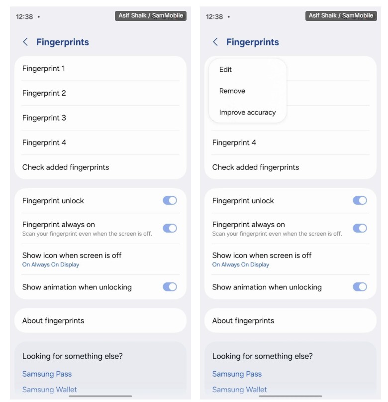 今回新たに確認されたのは「精度を向上」という指紋認証関連のオプションです。この機能を使うと、登録済みの指紋を再スキャンすることで認識精度を高めることができます。