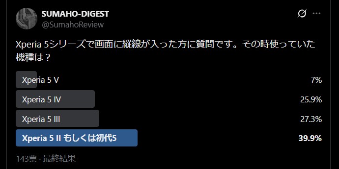 回答数は143票で、初代からXperia 5 IIIまでの旧モデルに発生が集中していることが明確になり、結果初代からIVの4世代が全体の9割以上を占めるという結果に。一方で、最終モデルとなるXperia 5 Vでは割合が大きく低下しています。
