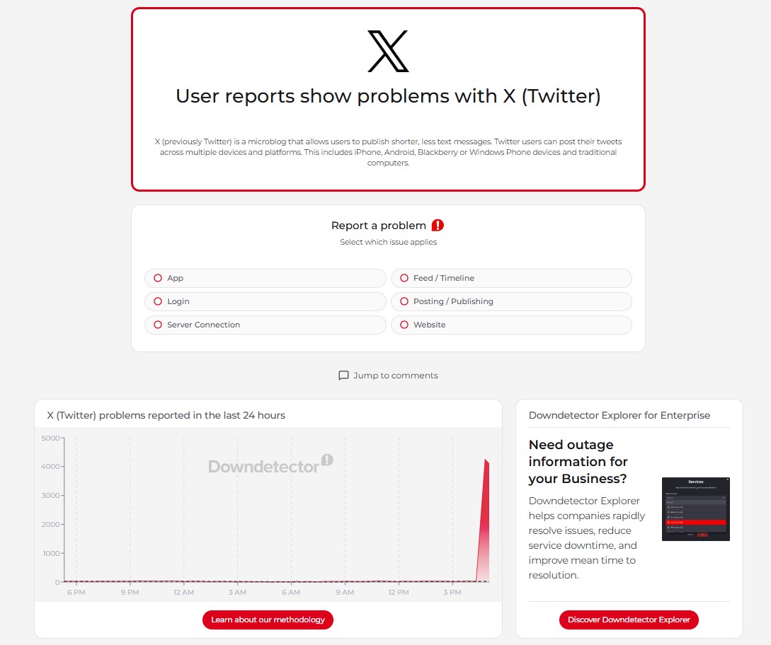 障害検知サービスであるDowndetectorのデータによると、同時刻帯において問題報告が急増しており、通常時と比較して明らかに異常なスパイクが確認されています。