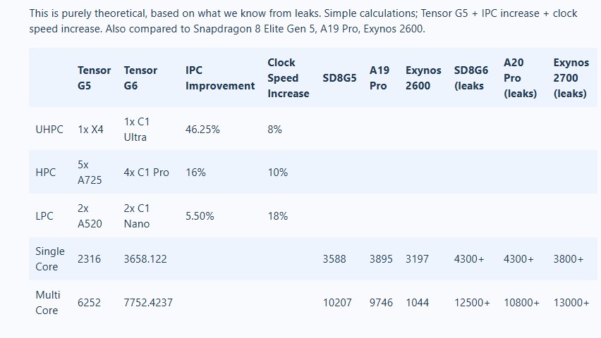 投稿では、Tensor G6のCPU構成やIPC向上率、クロックの引き上げ幅などを踏まえ、前世代のTensor G5との比較を中心に試算が行われています。