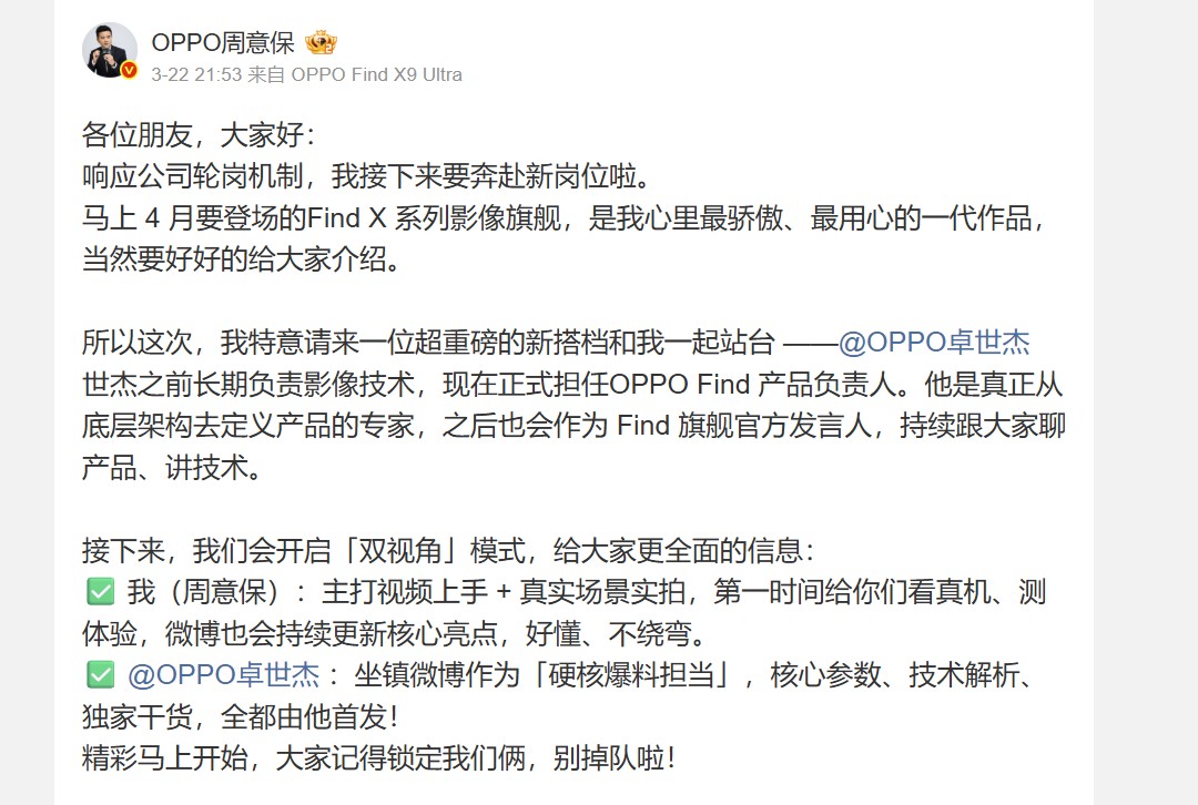OPPOのフラッグシップ「Findシリーズ」において、プロダクトマネージャーの交代が発表されました。これにより、今後の製品展開や情報発信のスタイルにも変化が生まれる可能性があります。