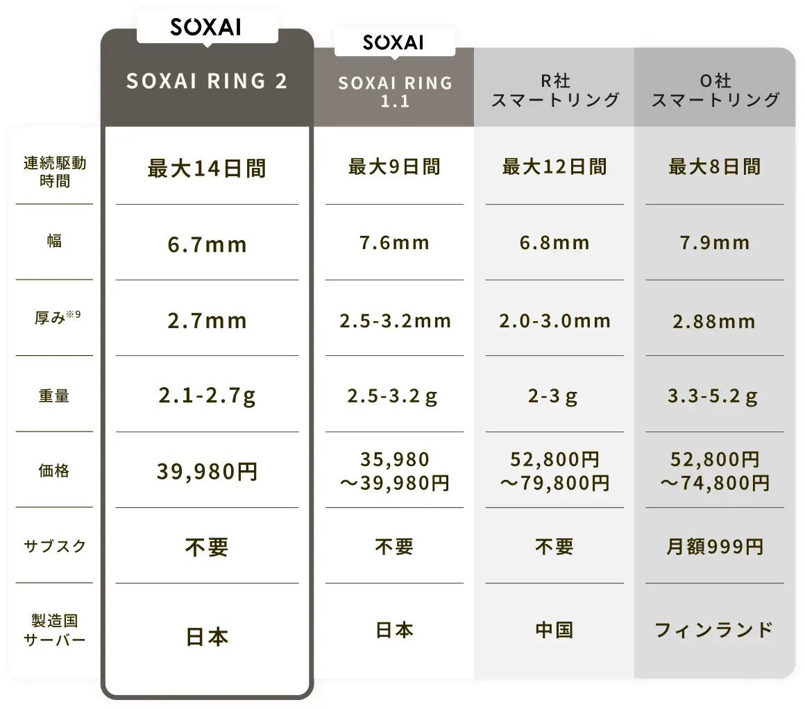 SOXAI RINGシリーズは、装着するだけで睡眠や体調、運動といった日常のデータを取得・分析できるウェアラブルデバイスです。心拍や体温、活動量などをもとに複数の指標をスコア化し、生活の質の改善をサポートします。