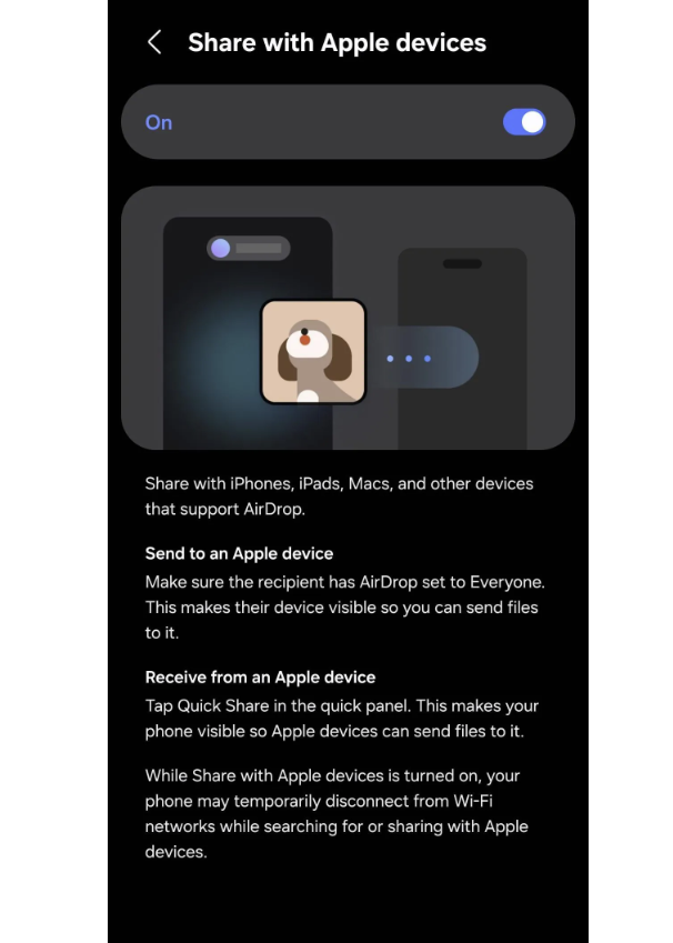 今回話題となっているのは、Samsungの共有機能「Quick Share」に追加された新しいオプションです。アップデート後、一部の端末ではAppleデバイスとの共有を示す項目が確認されており、事実上AirDrop互換とも言える機能が準備されていることが分かります。