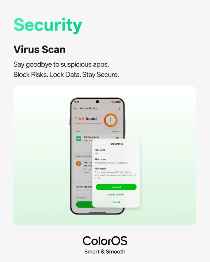 セキュリティ面では、システム内で動作するウイルススキャン機能が新たに追加されました。これにより、疑わしいアプリを検出し、その場で削除することが可能になっています。