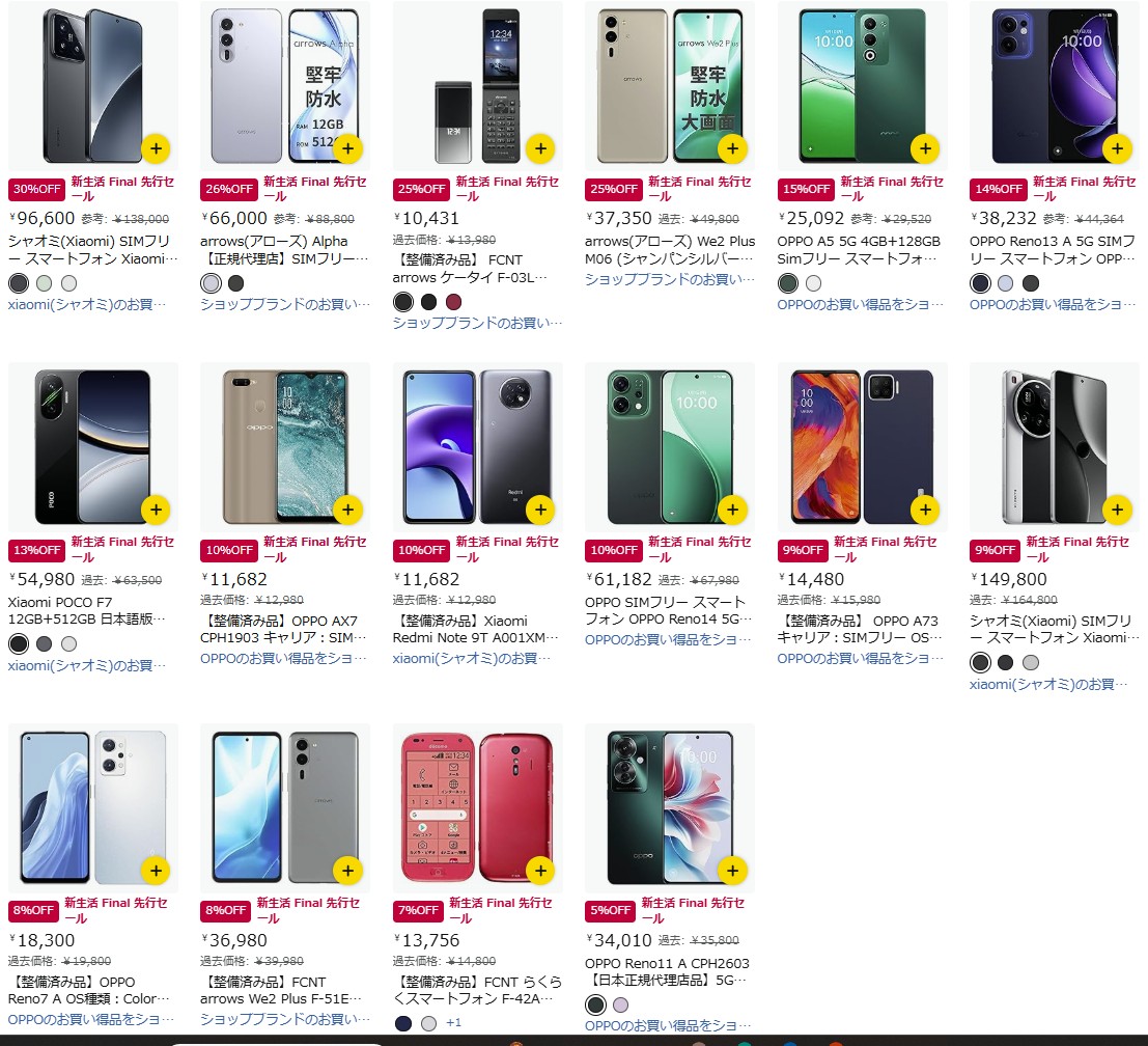 上記の超目玉モデル以外にも、Xiaomi(POCO)やOPPOの人気シリーズがお買い得になっています。以下に、現在セール対象となっている新品スマートフォンをまとめました。