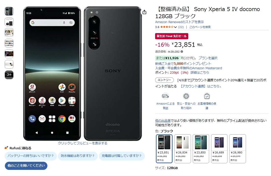 Xperia 5 IVの整備品については、当サイトでも先月に2万円台後半まで値下がりしたことをお伝えしましたが、今回のセールではそこからさらに16%、約5,000円前後の値下げが実施されています。