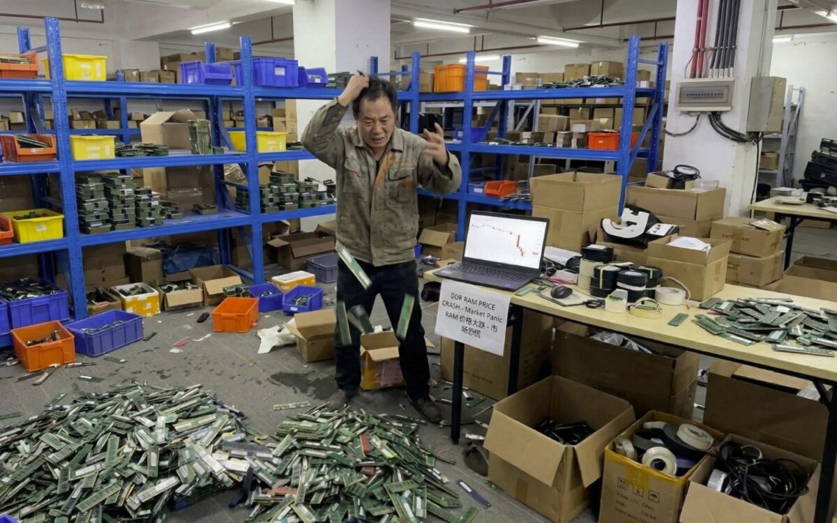 中国のSNS上で公開された動画では、大量のDDRメモリ在庫を抱えた販売業者が、価格の急落に強い不安を示す様子が確認されています。