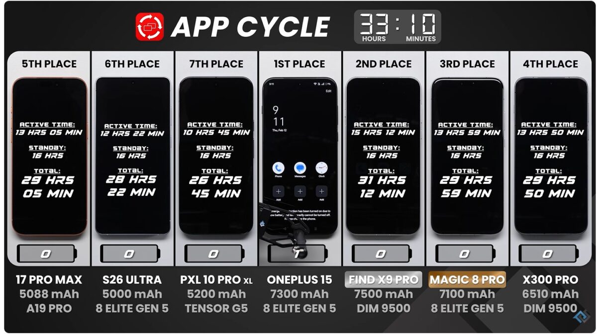 最終的な結果では、Pixel 10 Proの脱落後も、GalaxyやiPhoneが順次力尽きていく中、OnePlus 15は合計33時間10分という驚異的な駆動時間を記録しました。Pixelが0%になった時にまだ半分近くの余力を残していたという事実は、ハードウェアの最適化とバッテリー密度の差が、いかに残酷なまでの結果をもたらすかを物語っています。