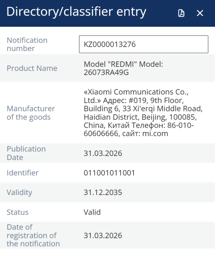 今回の情報の発端となったのは、ユーラシア経済委員会(EEC)の認証データです。ここに「26073RA49G」という型番の端末が登録されており、これが次期Redmi Noteシリーズに属するモデルとみられています。