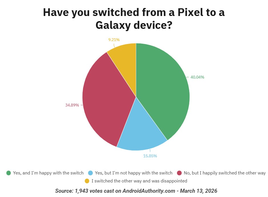 Android Authorityが実施したアンケートでは、約1,900票以上が集まり、そのうち約55.9%のユーザーがPixelからGalaxyへ乗り換えたと回答しています。単純な人数だけ見れば、Galaxy側への移行が優勢という結果です。