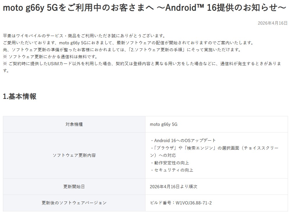 ワイモバイルは、同社が取り扱うスマートフォン「moto g66y 5G」に対し、最新OSとなるAndroid 16の提供を2026年4月16日より順次開始しました。すでに対象ユーザーにはアップデートの配信が始まっています。
