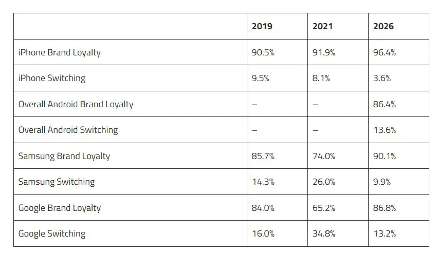 特に注目すべきは、どちらのプラットフォームでも年々ロイヤルティが上昇している点です。つまり、ユーザーが他のOSへ移行するハードルは確実に高まっているといえます。