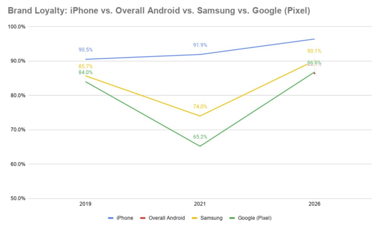 米国のユーザー5,000人を対象とした調査によると、Androidのロイヤルティは86.4%に到達。一方でiPhoneは96.4%と、さらに高い数値を記録しています。
