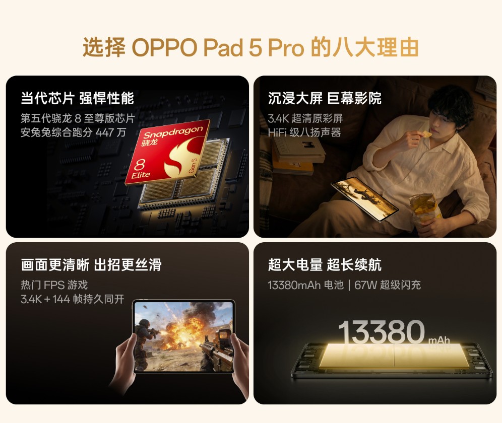 Pad 5 Proは、同社タブレットの最上位モデルに位置付けられる一台です。チップセットにはSnapdragon 8 Elite Gen 5を採用し、最大16GBのLPDDR5Xメモリと512GBのUFS 4.1ストレージを搭載。処理性能は現行Androidタブレットの中でもトップクラスと言えそうです。