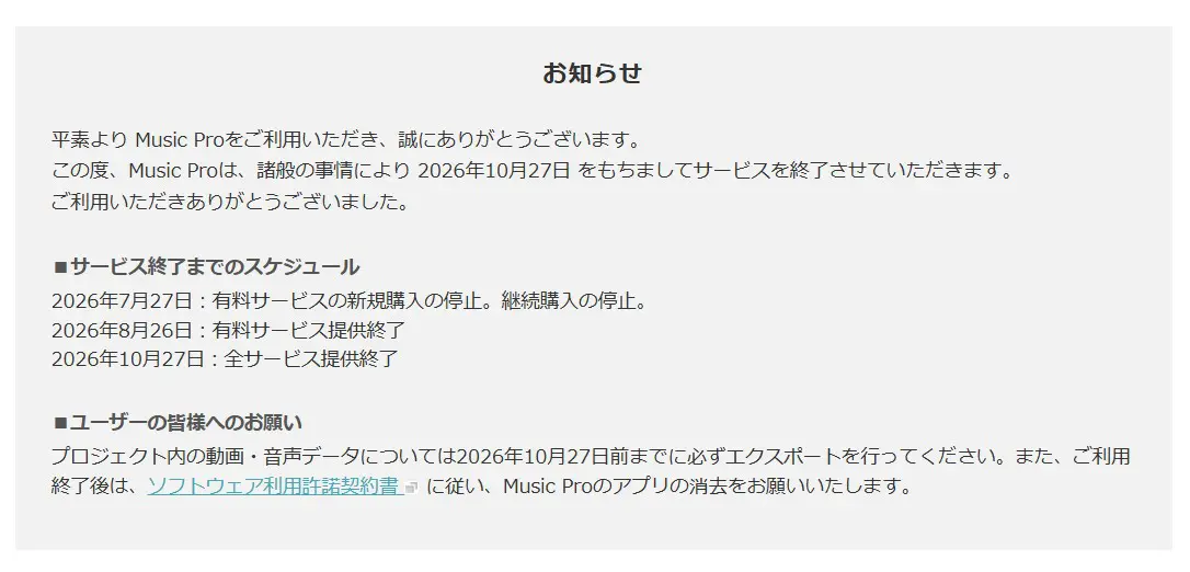 終了後はアプリの利用ができなくなるため、制作中のデータや保存済みの素材がある場合は、早めの対応が必要です。また、利用終了後はソフトウェア利用許諾契約に従い、アプリの削除も求められています。